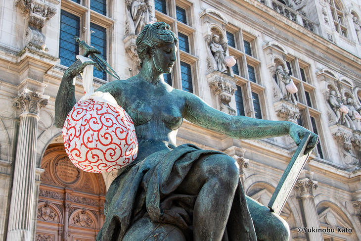 風呂敷づくしはパビリオン内だけではありません。パリ市庁舎の壁面を飾る像も、このイベント期間だけは風呂敷を持ってお出かけ。「FUROSHIKI PARIS」の企画に花を添えます