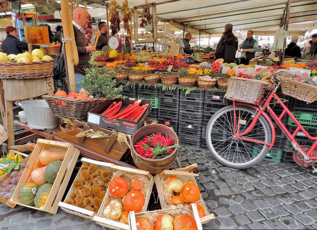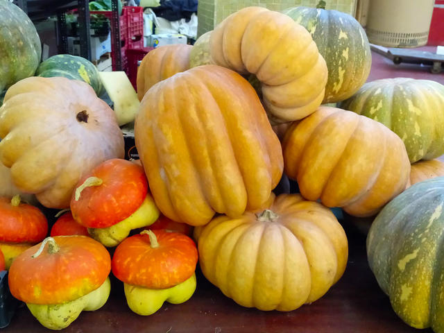 ↑ 10月に入って市場に行くと、カボチャが飾ってありました。昔、イタリア中部の町ペルージャで、日本人の留学生さんがハロウィン用のつもりでお部屋にカボチャを飾っておいたところ、ホームスティ先の家族がリゾットにしてしまったという話を思い出しました。いつまでも置いてあるので料理方法が分からないのかと思い、おいしいカボチャのリゾットに調理してしまったそうです。