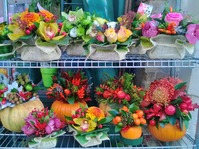 ↑ ポポロ広場の近くにある花屋さんでは、カボチャをお花の器にしていました。オレンジ色は元気が出る色です!