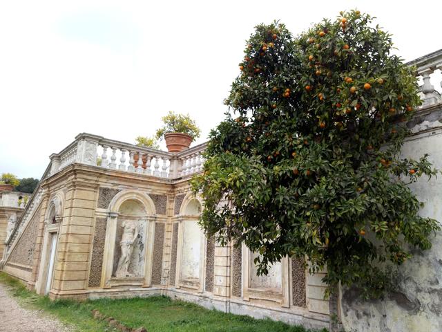 ↑ ここでもオレンジがたわわに実をつけていました。最近の研究報告では、枢機卿はヴィッラのプロジェクトをバロック時代の建築家ボロミーニにも依頼していたことが分かっていますが、建設に携わった重要な二人の人物は、前述のアレッサンドロ・アルガルディと、建設の現場監督として指揮を執った、建築家で画家でもあるジョヴァンニ・フランチェスコ・グリマルディです。