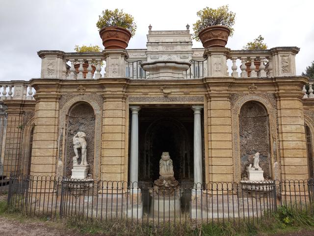 ↑ ファウヌスの噴水と呼ばれる怖い噴水が、テアトロの庭の中心を飾っていました。奥に見えるのが、先程ご紹介したイタリア式庭園の前のベル・レスピーロの小邸宅です。手前にヴィーナスの噴水も見えます。古代彫刻を施されたこの様な小邸宅は、内部に美術品のコレクションを招き入れる目的も持っていました。いつの時代にも、領主は所有する土地を出来る限り美しく飾り、自らの権力を誇示したい強い欲望がありました!