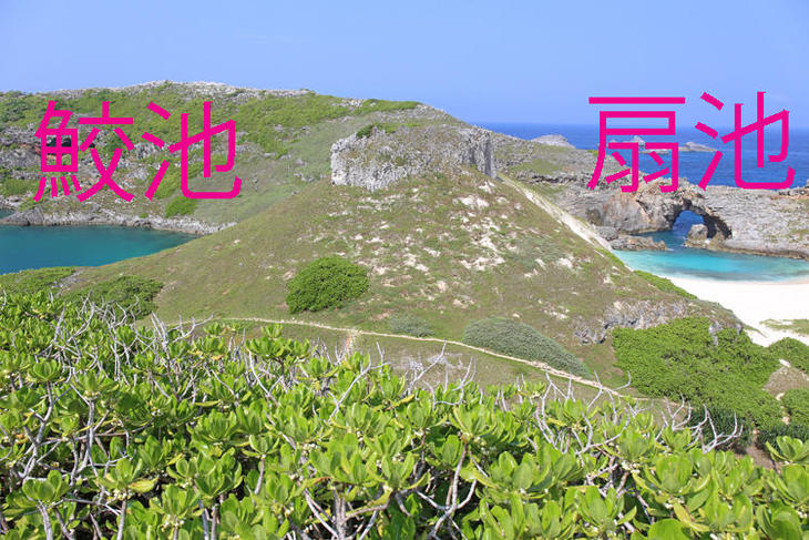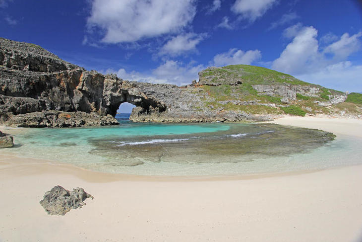その中央部にある扇池は真っ白な砂浜に岩のアーチ
