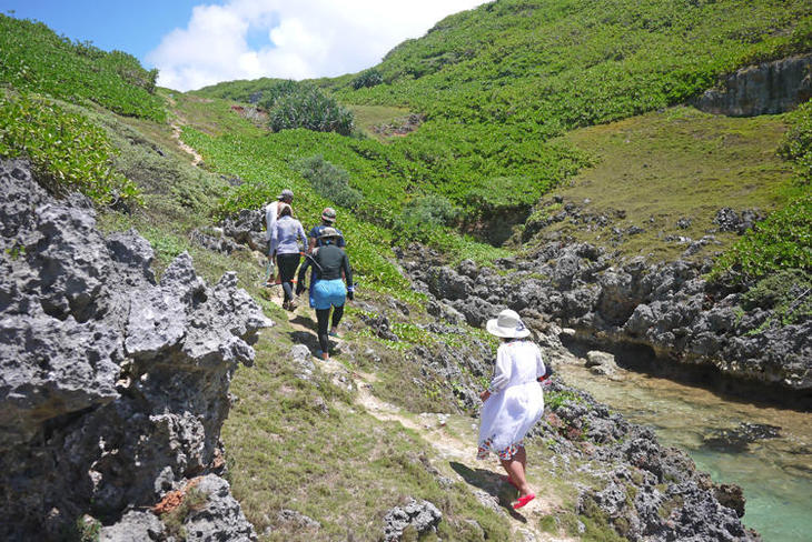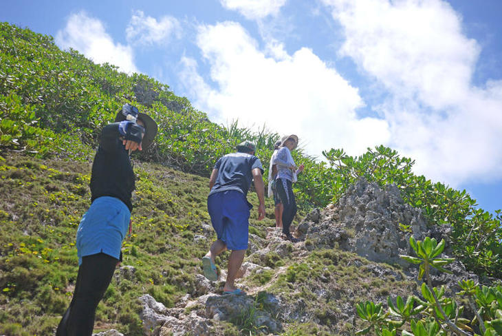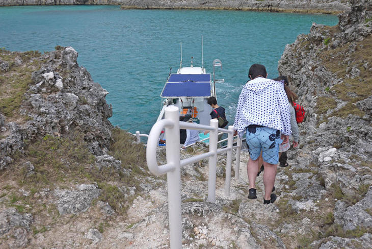 ①鮫池からは島にボートを接岸して急な岩肌を登り降りします。