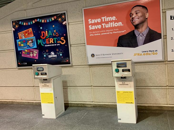 降りる駅は終点なので間違えることはない。 駅の改札を出る前には必ずトランスファーを貰おう。 全く目立たない場所にあるので見落としてしまいそうだけど、ホームを降りて改札口手前の右側にチョコンとあるんでポンとボタンを押す。 今回すっかり貰うのを忘れ、バス代2ドルを払ったが、あれば1ドル引いてくれる(2時間以内の利用)つまり往路は1ドルで行ける。