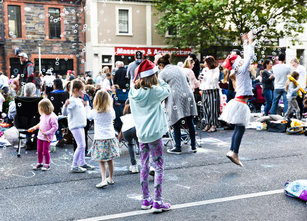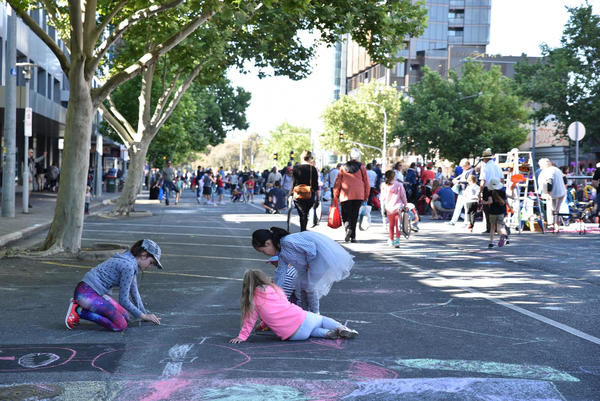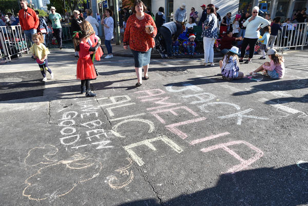↓パレードがスタートする前の2時間くらいは道路が子供たちの黒板になります、彼らの感じるクリスマスを楽しく描いている子供たちが印象的です