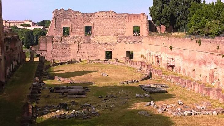 パラティーノの丘の大部分となっているのは、約300年間、皇帝の主宮殿として使われたドミティアヌス帝の建造物群の遺跡であり、皇帝の宮殿(伊語:Domus Flavia)、皇帝の私邸(伊語:Domus Augustana)、競技場と3つに分けられている。 皇帝が私的な娯楽や競技に使っていたと考えられている競技場の近くにはセブティミウス・セヴェルスの浴場(伊語:Terme di Settimio Severo)の遺跡もわずかながらも残っている。これらの遺跡群は、現在は野原になっているが、ローマ最大で20万人収容の競技場とも言われたチルコ・マッシモ(伊語:Circo Massimo)から眺めてみるとその規模の大きさに改めて驚かされる。