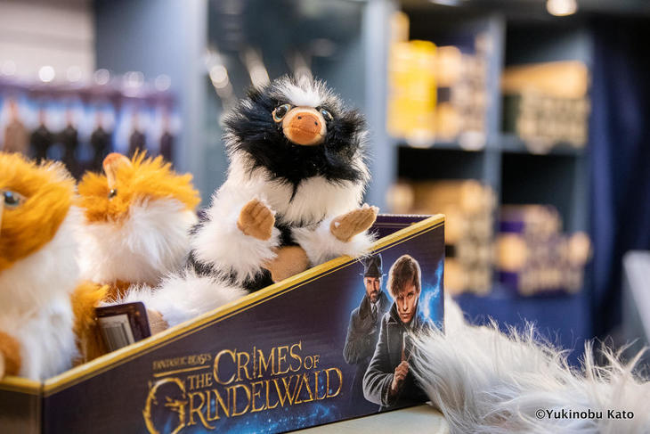 ポップアップストアは紳士館の地上階にあります。紳士館のショーウィンドーではエディ・レッドメイン演じる「ファンタビ」シリーズの主人公ニュートらがお出迎え。店内のショップには『ファンタビ』に登場する魔法動物のぬいぐるみや、ハリーポッターが持つ定番の杖やマント、映画をモチーフにしたカバン、小物入れ、パズル、文房具などグッズが一通りそろいます。