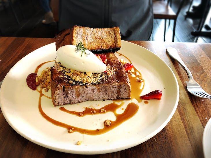 紫色のタロイモパンを使ったフレンチトーストも人気メニュー。まるでフレンチ料理のように、メープルシロップがセンス良くかけられています。