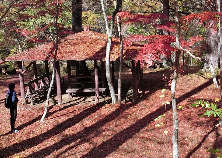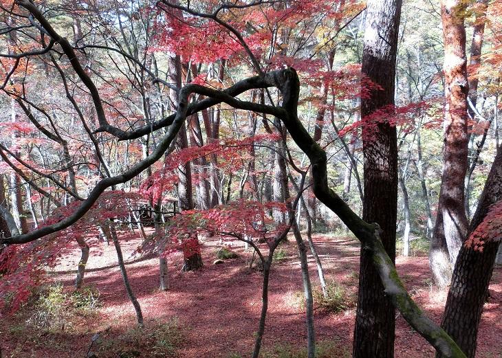 突如真っ赤なスポットが、現れました。「天鼓林(てんこりん)」と呼ばれる場所ですが、モミジの絨毯とまだ枝々に残っている葉の赤が、ひとつになって目に飛び込んできました。