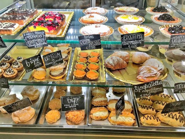 ↑ イタリアの典型的なスイーツが並ぶローマのお菓子屋さん。イタリアではヌテッラは様々なスイーツに使用されています。