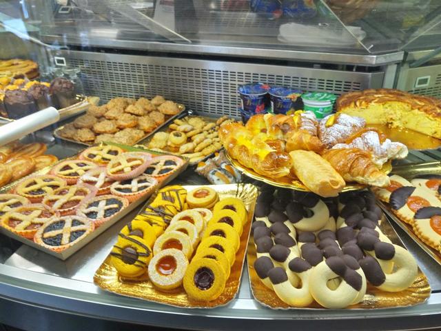 ↑ バールのカウンターに並ぶスイーツです。写真中央に見える丸いものは、オッキオ・ディ・ブエ (牛の目玉)というお菓子です。焼いたとても軟らかいビスケット地を重ね、真ん中の目の部分にクリームやジャムが入っています。目玉の部分には、良くヌテッラやクリーム類が使用されます。この場合は一番左にあるのがヌテッラの牛の目玉です!