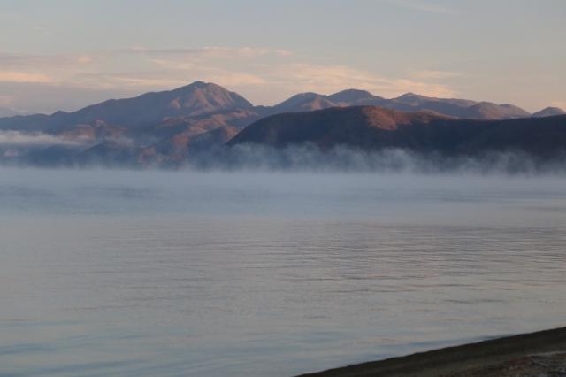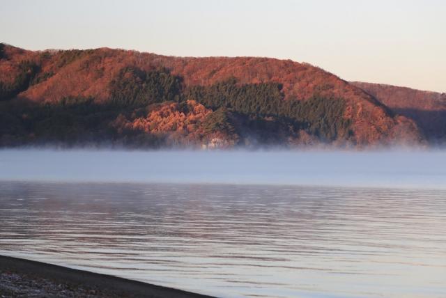場所を変え、猪苗代町の上戸浜から五万堂山をバックに立ち昇る気嵐を眺めてみました。