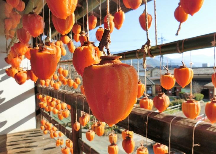 ころ柿は「枯露柿」とかきます。木枯らしに吹かれ朝露にさらされた柿という意味や、風に吹かれてころころ回る姿から「ころ柿」と呼ばれるようになったとか、諸説あるようです。ここ甲州市で主に作られている山梨県の特産品です。大きな百目柿で作るのが特徴でしょうか。甘くて美味しいんです。
