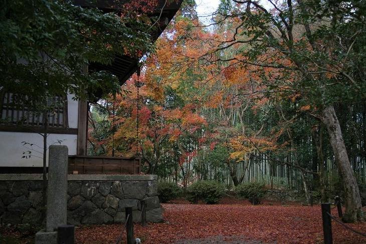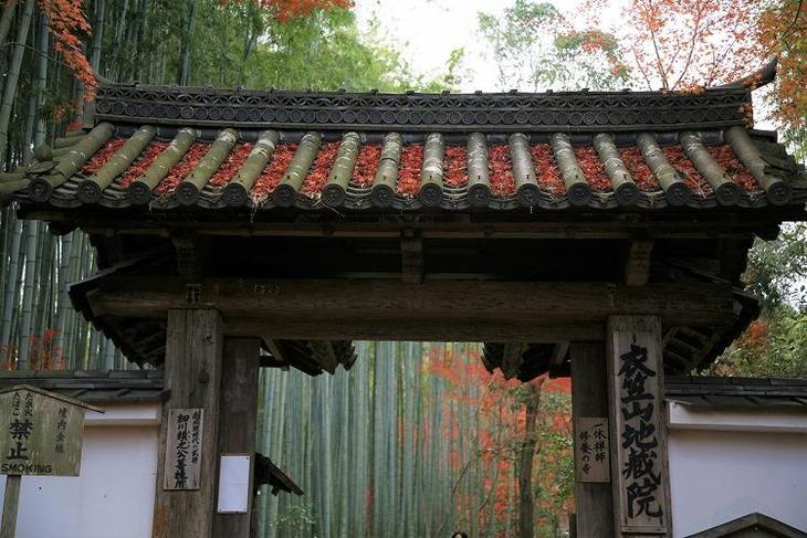 小高い丘に並ぶ住宅街を少し歩くと、紅葉と竹に包まれた山門が見えて来ます。