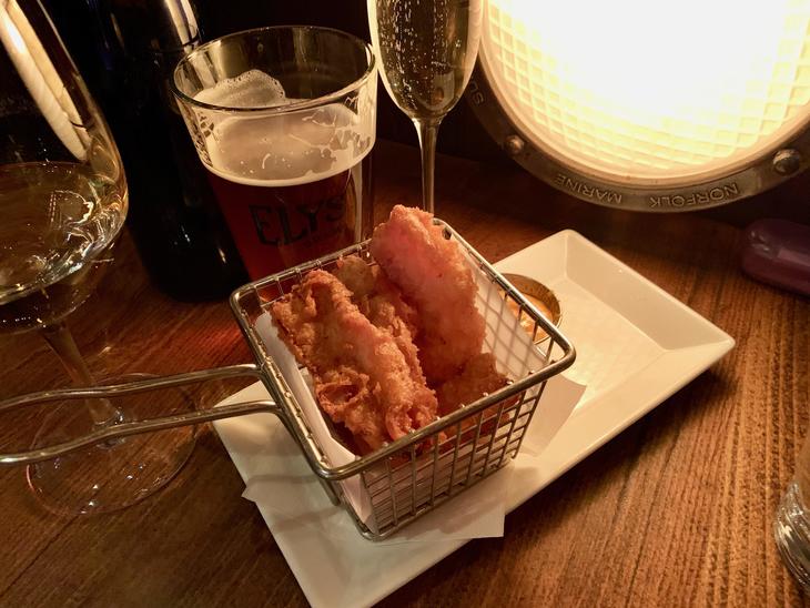 何故か即決即座、ハッピーな時間が始まった。 お店の地下にはブリュワリーがあってホームメイドビールがある 『Toy Solder IPA(HH $4)』 苦味が強くなくてコクがあって美味い。 6時までのハッピーアワードリンクは8ドル以下。 聞いたらそれだけで太ってしまいそうだアップルウッドでスモークされた厚切りベーコンを揚げた 『Beer Battered Beacon(HH $8)』 はカリッといい感じヤ・バ・イ・ビールが進む。