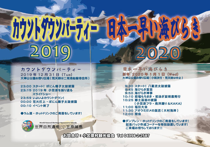 タイムスケジュール23:00 スタート!ぼにん囃子太鼓披露23:15 2019年小笠原を振り返るスライドショー23:59 カウントダウンスタート00:00 花火打上・ぼにん囃子太鼓披露00:10 イベント終了