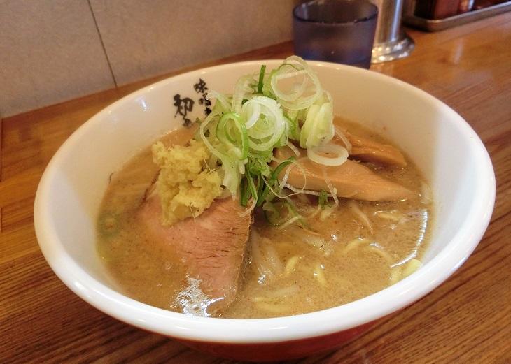 こちらは味噌ラーメン専門店『初志貫徹』の「味噌らぁめん(税込み850円)」です。生姜がたっぷりのっているのが、ここの味噌。ひと口目はこってり動物系の濃厚な味わいなのに、さっぱりとして感じられるのは生姜の魔法かな。