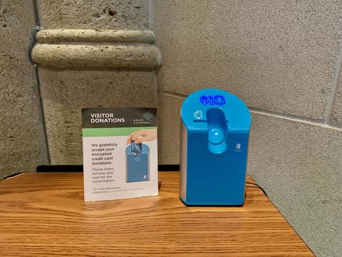 入り口には、寄付金用のジャーが置いてるんだけど、その脇にはクレジットカード用端末も設置。