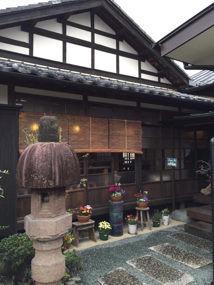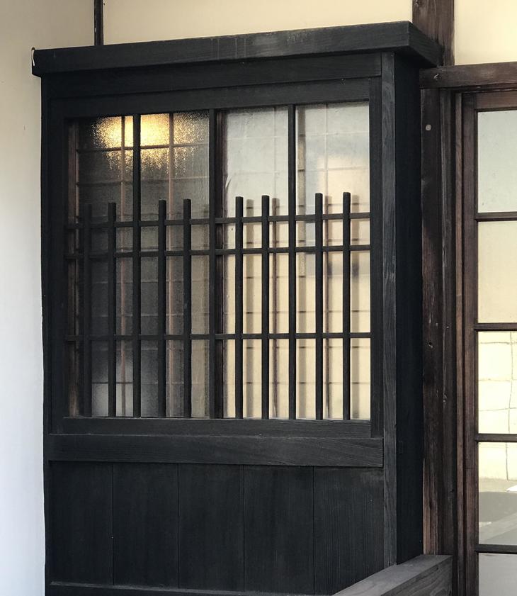 玄関の木枠のガラス戸の向こうは灯籠が!