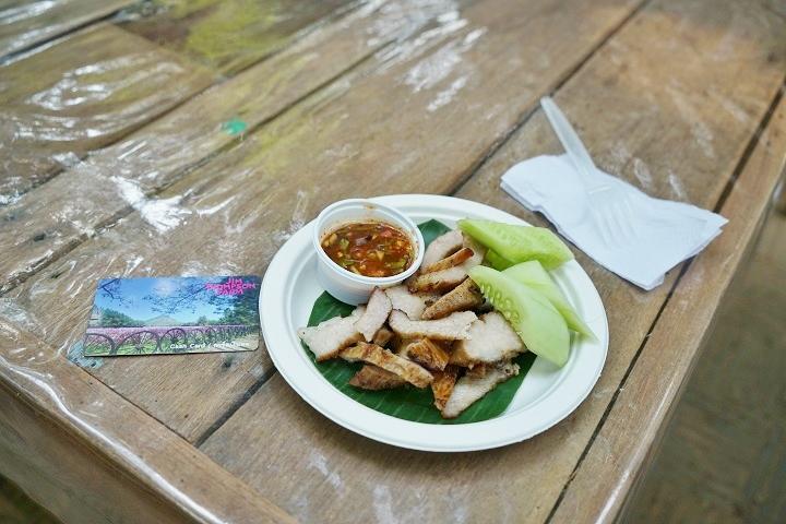 ジムトンプソン・ファーム内では、食事もできます。タイのフードコートのように、窓口で、「200バーツ(タイ語:ソーンローイバーツ。=日本円で約680円)」と言えば、200バーツ分入金されたクーポン(見た目はカード)をもらえます。このクーポンは、農場内のフードコートならどこでも使えるそうです。残金は換金できます。私達は、到着直前に、おにぎり等を食べていましたが、せっかくなので、私の大好きなタイのイサーン料理である、ム―ヤーン(豚肉の炭火焼。1皿、70バーツ=約238円)とカオニャオ(タイのもち米。1皿、10バーツ=約34円)とペットボトルのお水(10バーツ=約34円)を購入して、食べてみることにしました。ムーヤーンは脂が乗っていて、おいしかったですよ~。