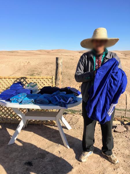 すぐに乗るのかと思いきや、モロッコ衣装を着せてくれるという、想定外の嬉しいサービスが。これでグッと気分がそれらしくなりました。夫婦にそれぞれ子供一人と同乗し、いざ出発です。