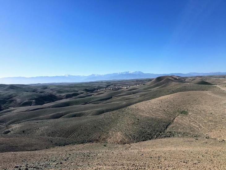 10時にマラケシュ市内をバンで出発し、移動する事45分程。観光地ではなく、普段の現地生活が垣間見える町を通り抜けると、荒野が広がり始めました。マラケシュがいかに都会か、という事がよくわかりました。更にオレンジ果樹園の先に、ラクダ乗り場のキャンプがありました。