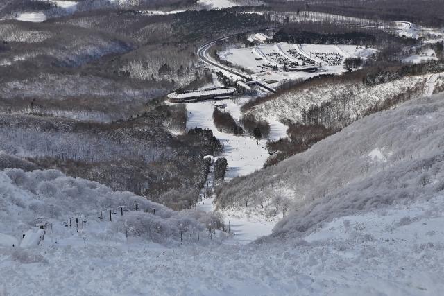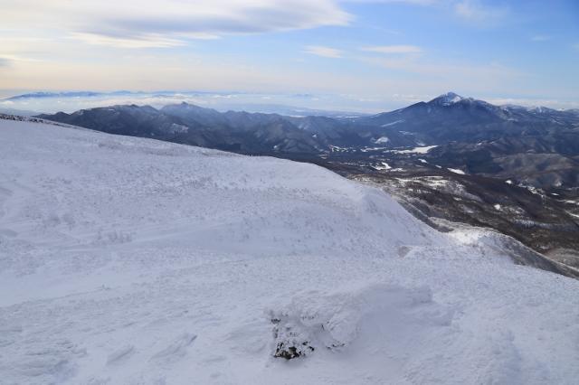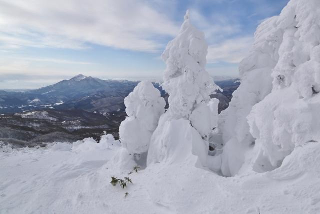 鬼面山を過ぎ、霧氷の先に福島盆地を俯瞰