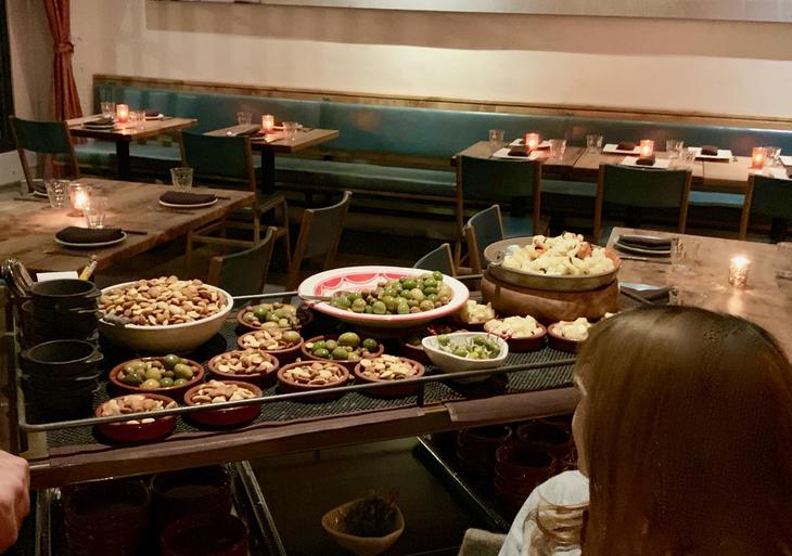 お腹空き空き我らにはいいアイディア! アーモンド・オリーブ・チーズピンチョス が小皿に入って回ってきた "カートはまるで飲茶" つい頼んじゃった、1個9ドルX3=27ドル