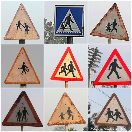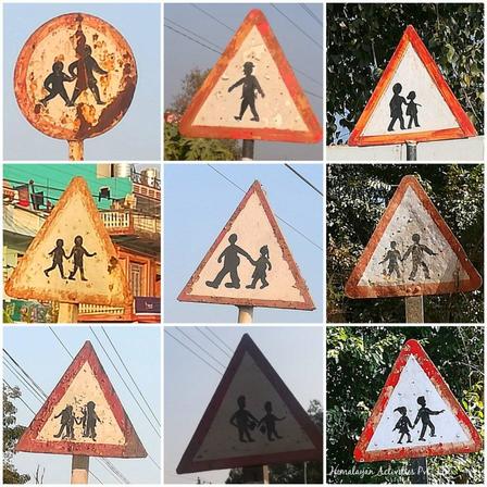 ネパール各地の「通学路」「歩行者注意」標識。地方では規格がないようで、見かけるものすべての絵柄が違い味があります。汚れや錆びもまたよし。
