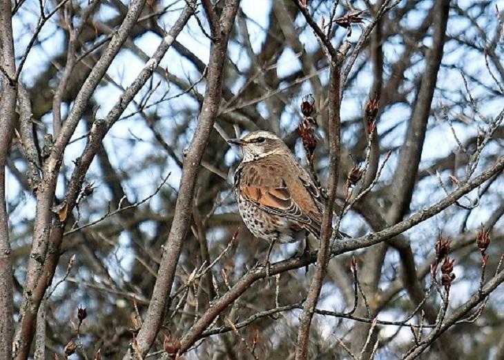 ツグミも渡り鳥です。シジュウカラやヤマガラより10㎝くらい大きいでしょうか。オスメスほぼ同色で見分けるのが難しいそうです。身体じゅうに三日月斑があるトラツグミも、見かけたことがあります。