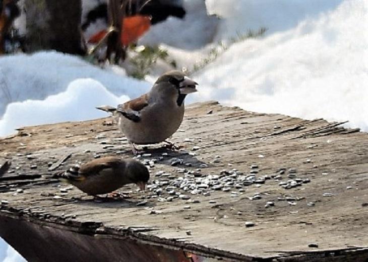 この子は、シメです。くちばしが大きいですね。シジュウカラやヤマガラは木の枝にひまわりの種を持って行って、枝にぶつけて割るんですが、シメは大きなくちばしを存分に使い、ここでゆっくり食べます。