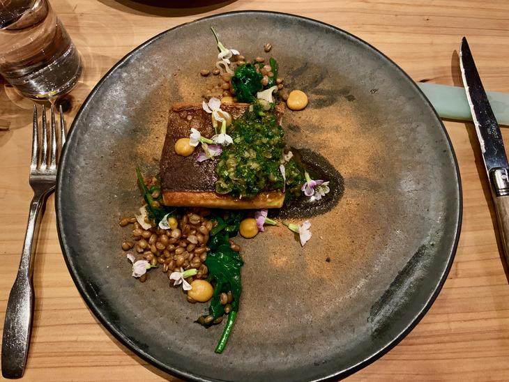 魚の皮好きですか? もしちょっと苦手と思ってる人でも試しに食べてみて! 身の柔らかさとパリっと煎餅みたいな皮がたまらない。 アメリカ人は皮を食べないので皮のない魚料理が多い中、天晴れとしか言えない。 サーモンより脂が軽く身が繊細な『トラウト(Mt Lassen Trout$26)』 なんだ鱒かよ〜と侮るなかれ、上品で美味い。