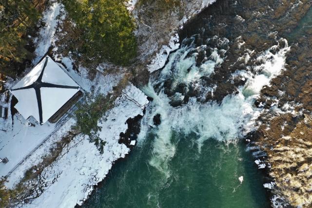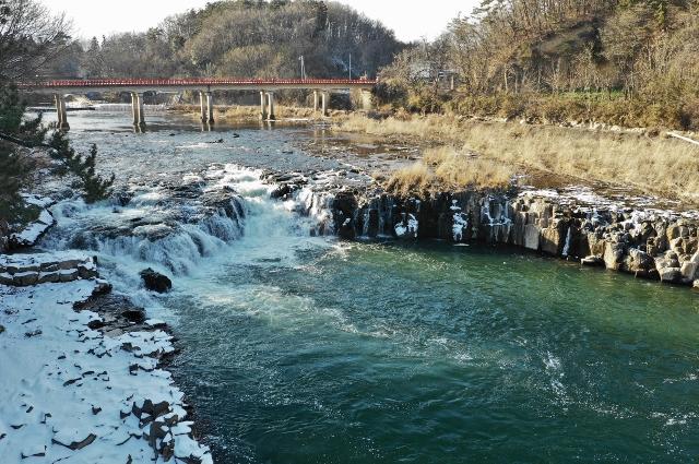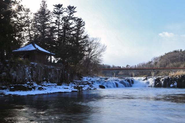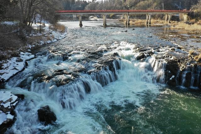 日本の滝百選の一つで、落差は約6m。幅は、水量によって大きく変化します。