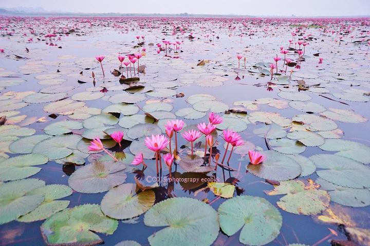 今回、私は、1泊2日の旅行で、この「紅い睡蓮の海(タレー・ブア・デーン)」へ2回も訪問してしまいました。早朝はもっと美しいのかな?!と気になってしまって…(^^;)