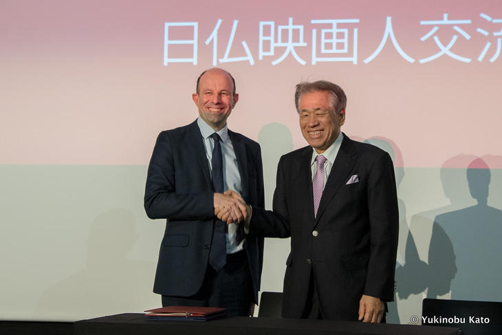 前半の日仏映画協力協定とは、日仏の映画協力や日本映画製作者のフランス進出を後押しすることを目的とした覚書です。2月15日に行われた式典は、2018年7月にフランス国立映画センターと公益財団法人ユニジャパンの間で合意に達したものの調印式です。