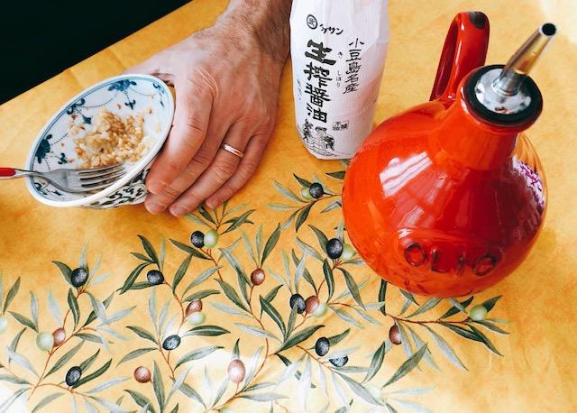 主人も、祖父母が経営するレストランで育ち、ノンナ(おばあちゃん)が料理人だったこともあり、お料理上手。アイデアマンでもある。そんな主人から "おかわり!"と 元気な声が。3杯目は、3種類あるオリーブオイルの中からトスカーナ産の搾りたてオリーブオイルを選択。そこへお醤油と合わせて食べるという。" あ!フォークとって!"とお箸から持ち替えて嬉しそうに食べ始めた。興味津々で一口もらってみる。あら。悪くない。なんだか得した気分。質素でもスローで優雅な昼食。