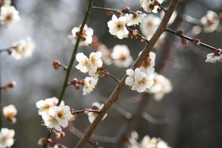 今、園内の梅林(紅白約60品種、約100本)では梅の花が次々と