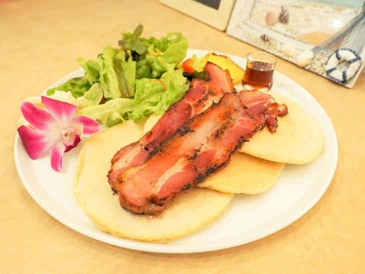 厚切りベーコンの旨味としっとりパンケーキの相性は抜群です。