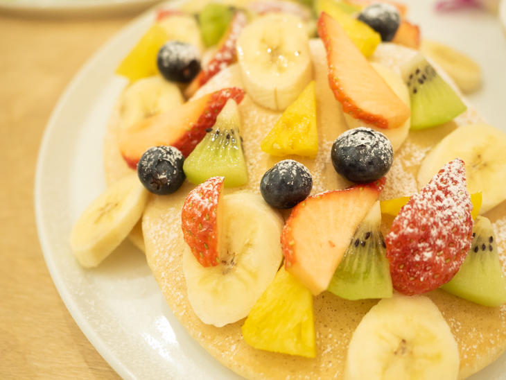フルーツ添えパンケーキをデザートとしてシェアしてもペロリといただけます。