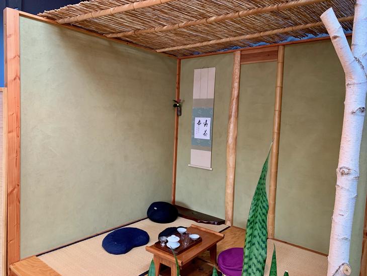 奥行きのある店内、奥には茶室もあり、お茶を点てることもできる。
