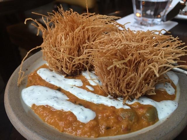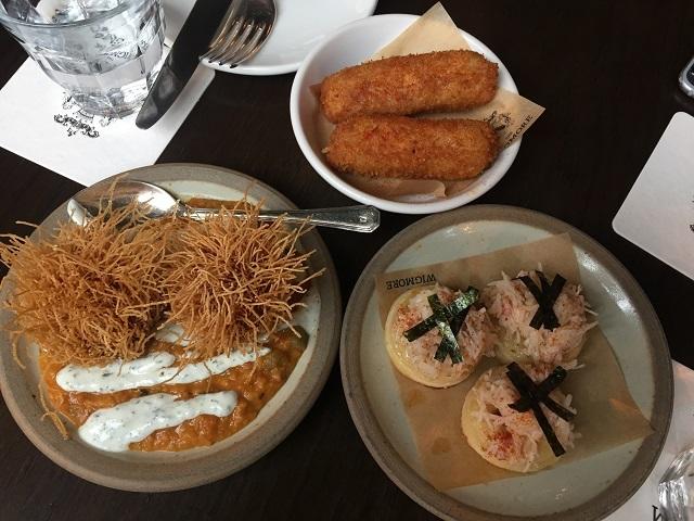 中にはウズラの卵と挽き肉、そしてスパイスの効いた豆カレーのソースが相性よし!あと2品はハムのコロッケと、蟹肉のクランペット。もしお腹が空いてたらメイン・ディッシュの中から選んだほうが良いけれど、ドリンクのお供にはちょうど良い味とサイズでした。