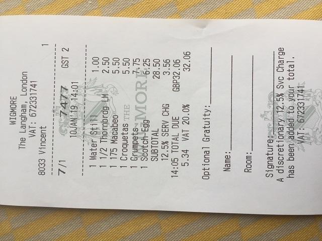 こちらがお会計。私はグラスワイン、友達はエールのハーフパイントを飲んで、サービス料12.5%が加算されて合計£32.06です。これを2人でワリカンしたので、場所を考慮したらリーズナブルだと思いました。ちなみにサービス料が既に含まれていたので、Optional Gratuity(追加チップ)は払わなくても非難は浴びませんよ。笑