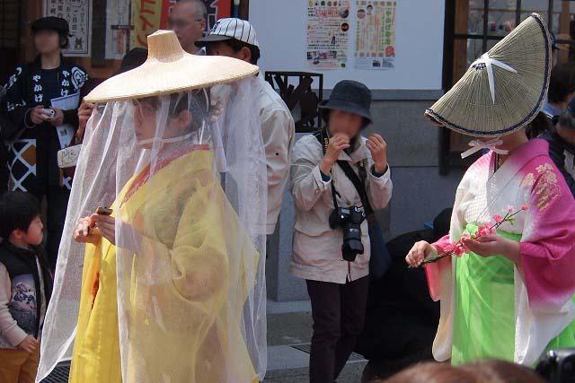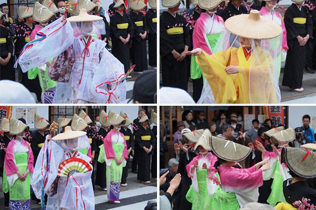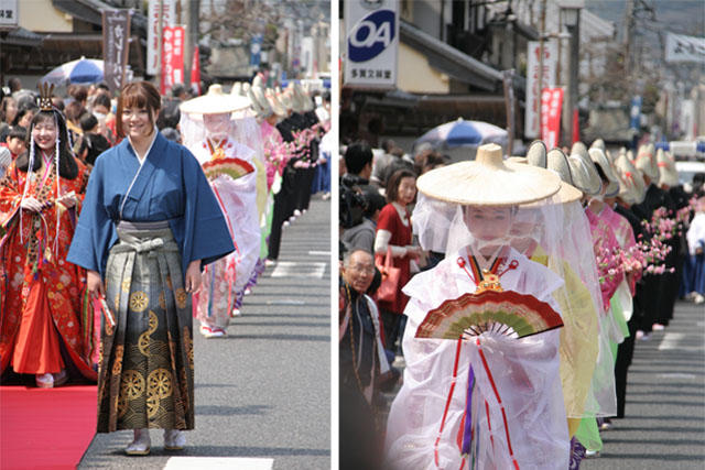 本陣・脇本陣通りでは人力車に乗った華やかな女びなを先頭に、町内の小・中・高校生が和服姿で着飾り、町を練り歩きます。