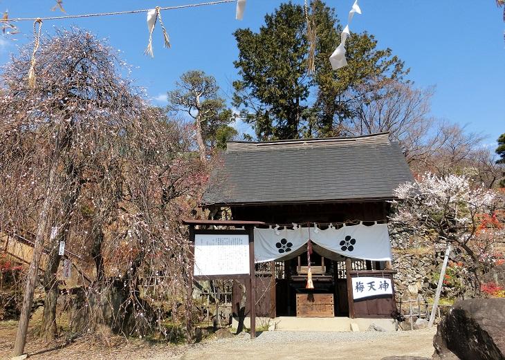 そこから梅を見ながら階段を上ると「梅天神」があります。菅原道真公がご祭神だそうです。道真公が詠まれた歌が掲げられていました。
