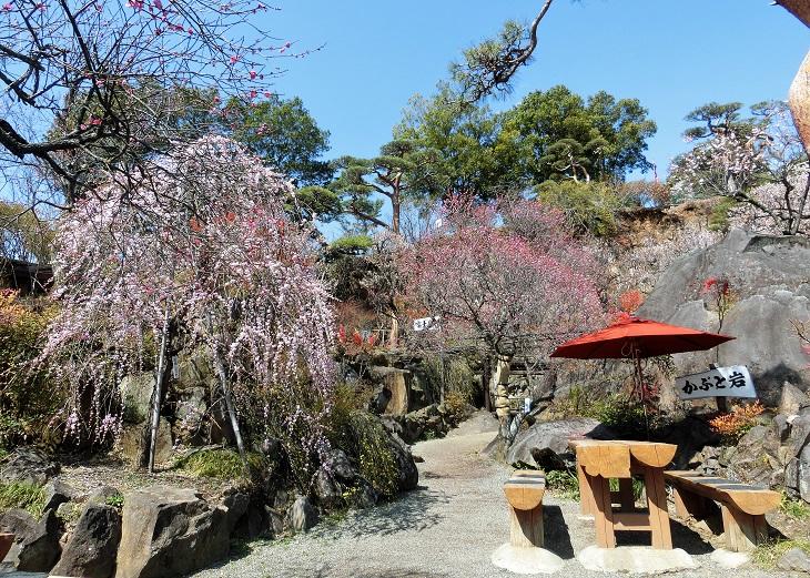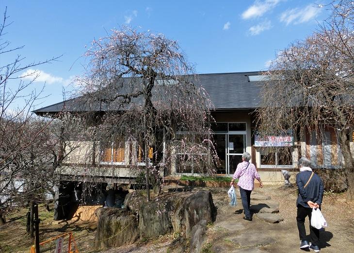 少し歩くと休憩所と売店があります。しだれ梅も綺麗。