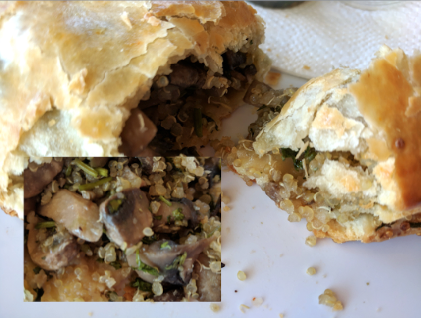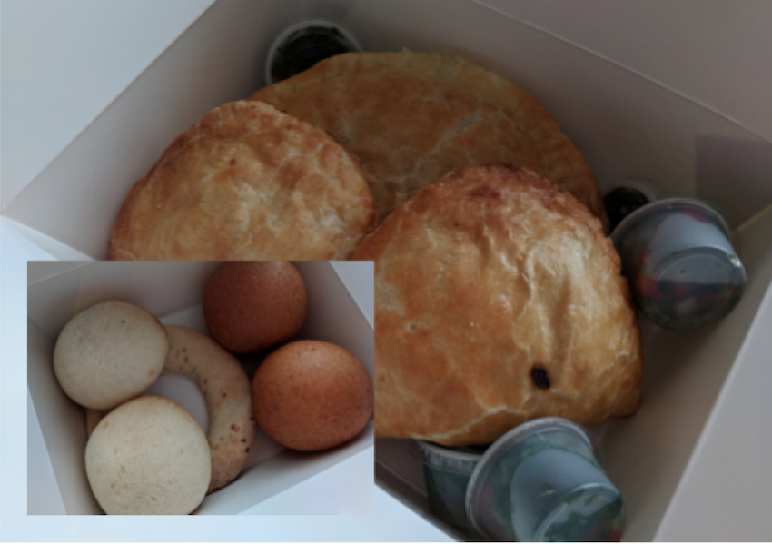 メインメニューはエンパナーダ。具入りのパンまたはペストリーことで、形は巨大な餃子にもにています。餃子の皮にあたる部分がペストリー生地で、具材も鶏肉&チーズ、パイナップル&ハム、キヌア&チーズ、じゃがいもなど、お食事系のペストリーです。