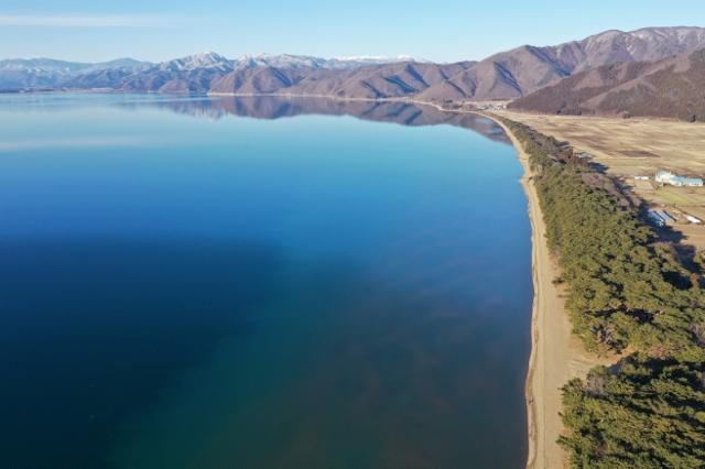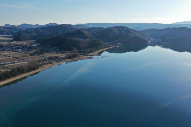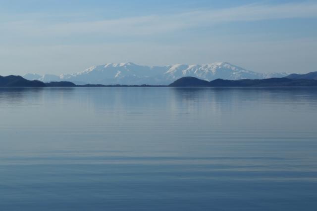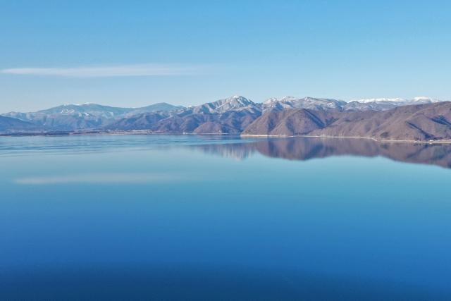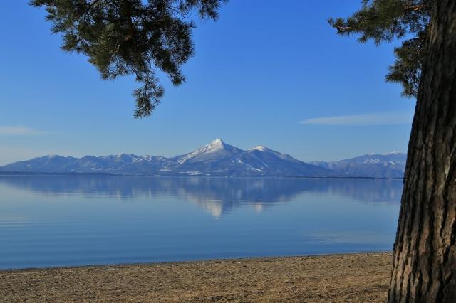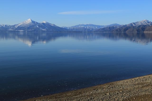 早春の青空と周辺の山々を映し出す湖面は、穏やかに、そして美しく輝いていました♪