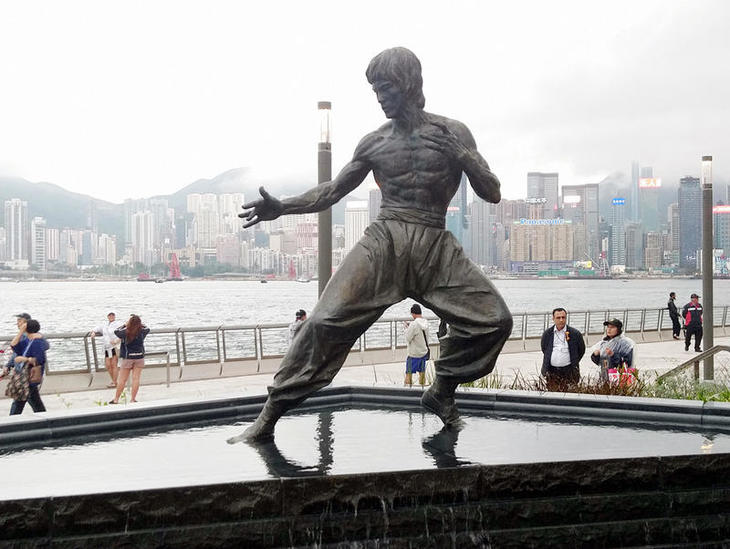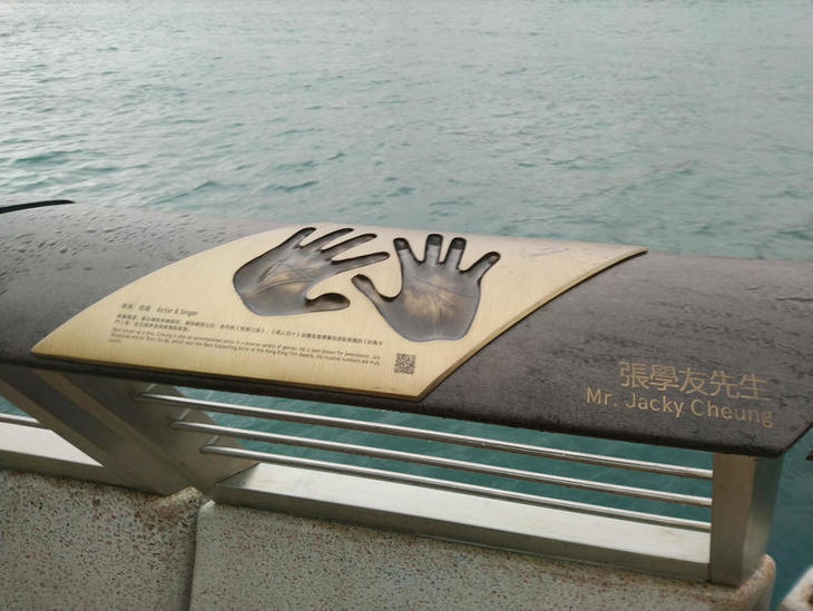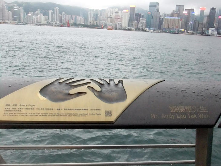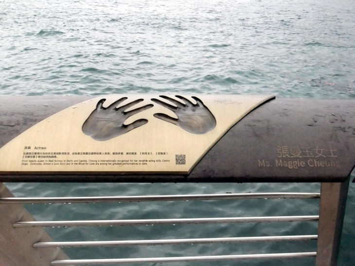 以前は道路に手形が埋め込まれていましたが、改修後は海沿いに設置された欄干に組み込まれたので、踏まれることで破損もしにくく、高さもあるのでしゃがみこみ必要がなくなったのは大きいと思います。ジャッキー・チェン、アンディ・ラウ、マギー・チャン、レオン・ライ、セシリア・チョン、サイモン・ヤムなどお馴染みの香港スター110人あまりの手形があります。手形の横にあるQRコードをスマートフォンをかざせば、その人の出演映画と短編動画が見られるようにしています。もちろん、そのためにWi-Fi設備も備えられています。この通りのメインともいえるブルース・リー、そしてアニタ・ムイとアニメのマクダルは像として展示されています。