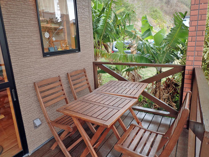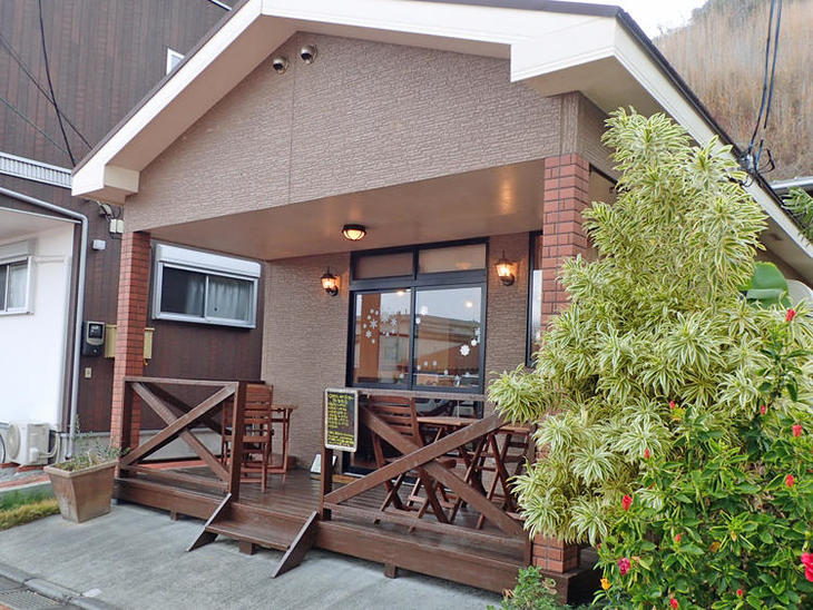 茶色いデッキと店休日のお知らせが出ているのが目印です。