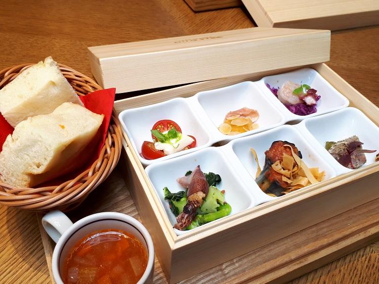 ランチセットはお肉とパスタそれぞれ3種類あり、本日の前菜6種、お代わりできるパン、スープがついてきます。
